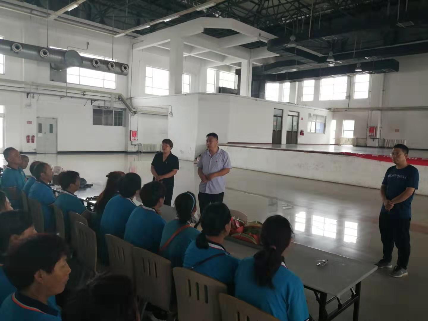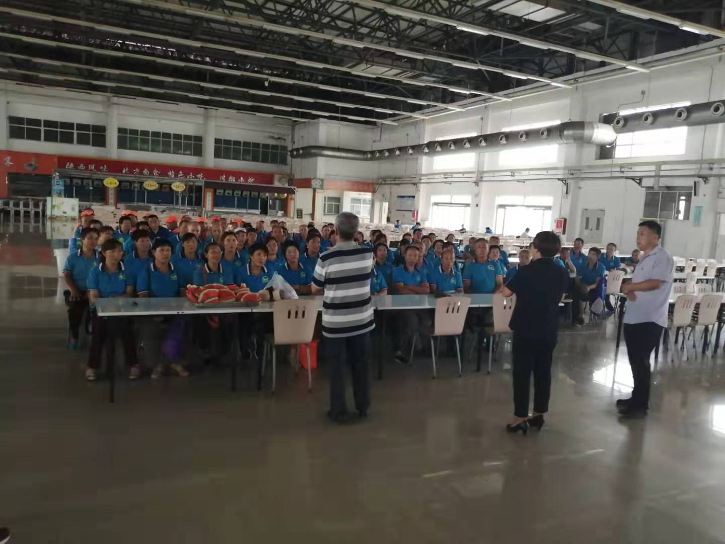 在富士康餐廳二樓,利用工作人員切西瓜的間隙,公司總經(jīng)理程晉軍作了簡(jiǎn)短的講話。他說,前一段時(shí)間,公司召開了“安康杯”勞動(dòng)競(jìng)賽動(dòng)員大會(huì),大家要提高安全意識(shí),始終把安全工作放在心上。他囑托大家在夏季工作中一定要注意防暑,感謝大家在酷暑下依舊兢兢業(yè)業(yè)奮斗在各自的工作崗位上。工會(huì)主席崔偉也作了簡(jiǎn)要發(fā)言,他說,今年是潔霸公司成立二十周年,希望大家在工作中繼續(xù)發(fā)揚(yáng)潔霸精神,積極樹立潔霸形象,為公司爭(zhēng)光。